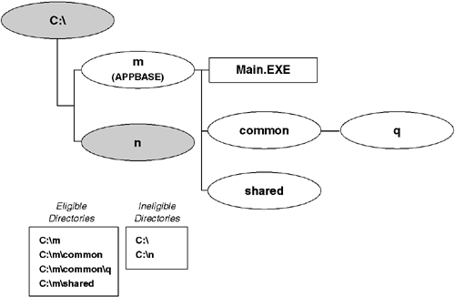 If the assembly resolver cannot locate the assembly using the GAC or a CODEBASE hint, it performs a search through a series of directories relative to the root directory of the application. This search is known as probing. Probing will search only in directories that are at or below the APPBASE directory (recall that the APPBASE directory is the directory that contains the application's configuration file). For example, given the directory hierarchy shown in Figure 2.13, only directories m, common, shared, and q are eligible for probing. That stated, the assembly resolver will probe only into subdirectories that are explicitly listed in the application's configuration file. Listing 2.7 shows a sample configuration file that sets the relative search path to the directories shared and common. All subdirectories of APPBASE that are not listed in the configuration file will be pruned from the search.