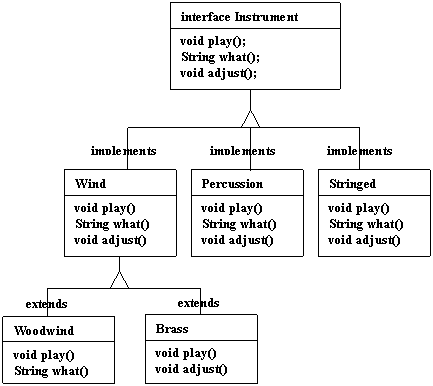 To make a class that conforms to a particular interface (or group of interfaces) use the implements keyword. You're saying "The interface is what it looks like and here's how it works." Other than that, it bears a strong resemblance to inheritance. The diagram for the instrument example shows this: