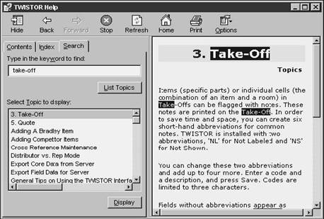 I was about 80% done with a sizable (14 MB .EXE) VFP 6.0 application, named TWISTOR, when we started addressing the issue of help. This app had been a rewrite (and major upgrade) of an old FoxPro DOS system. My customer had just assumed that they'd do the same for help as they did last time-hold a few training classes and include a printed manual. Unfortunately, this system was so much larger and more complex that a training class wasn't going to be sufficient, and the complete manual would have ended up being 500 pages.