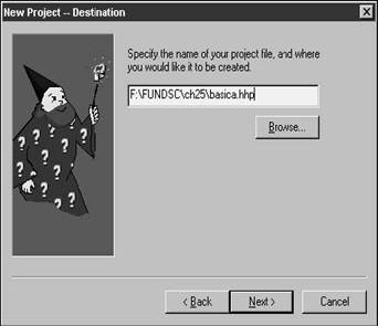 Instead, click the Browse button to open the File, Open dialog, and navigate to the desired directory. Then enter the name you want to use for your project file (yes, even though the dialog says "Open") and click OK. The path and project file name will be filled in for you in the wizard, as shown in Figure 25.9.