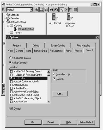 Then close the Properties dialog, right-click the Installed Controls item again, and select the Refresh Controls menu option. If the VFP Registered Controls check box was checked, the Component Gallery will scan through the list of controls registered on your machine and display only those that are registered with VFP, as shown in Figure 17.2. If the VFP Registered Controls check box was not checked, the Component Gallery will display all ActiveX controls registered on your machine. Because reading the registry is slow, refreshing the list can take some time-on a desktop P500 with 50 or 60 gigabytes of RAM, it might take about five seconds to display all 175 ActiveX controls.