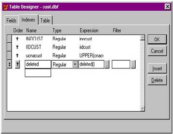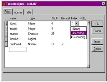 The previous section doesn't do you much good if you haven't created indexes, so let's cover that next. Remember that a single index tag is simply a description of the order in which a table will be ordered, and a compound index file (with the .CDX extension) can contain one or more index tags. If a table doesn't already have a .CDX file, it'll be created when you create the first index tag. If it already has a .CDX file, additional index tags will be added to the existing .CDX file.
