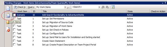 Visual Studio Team System's source control is tightly integrated with check-in policy. When we check-in, we will need to associate this check in with the work item that we started this demonstration with. Select the second icon in the