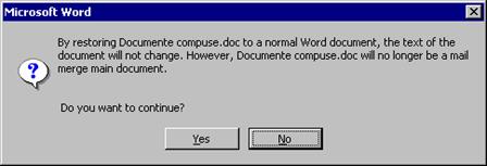 Reconvertirea documentului principal in document normal se face alegand optiunea Restore to Normal Word Document (Revenire la un document normal Word) din meniul pop-up al butonului Create. Aceasta inseamna ca vor fi elimitate toate asocierile cu sursa de date, deci documentul nostru nu mai este document principal. Ti se va cere confirmarea continuarii acestei actiuni.