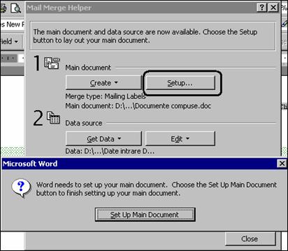 Daca vrei sa configurezi un document cu etichete de corespondenta (Mailing Labels) vei folosi instrumentele de formatare a etichetelor din Word. Vei observa ca butonul Edit din zona Main Document se transforma in Setup, pentru ca tu sa poti ajusta asezarea in pagina a etichetelor in orice moment.