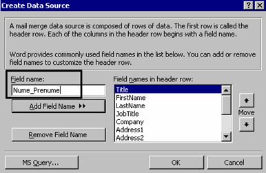 Ultimul pas este stabilirea legaturii dintre campurile declarate in formular si baza de date. Pentru aceasta te vei folosi de bara Mail Merge care a fost afisata automat cand ai apasat butonul Get Data in pasul anterior. De pe acesta bara vei folosi butonul Insert Merge Field care iti va desfasura o lista cu toate campurile pe care le-ai declarat in baza de date. Trebuie sa plasezi cursorul in formular in campul de compunere si apoi din acesta lista sa executi clic pe numele campului pe care doresti sa-l inserezi. V-a apare inserat numele campului, iar in momentul listarii se va face citirea efectiva a articolelor din fiecare coloana a bazei de date. Folosindu-te de bara Mail Merge ai posibilitatea sa comuti de la o inregistrare la alta, sa trimiti informatiile direct la imprimanta, sa cauti anumite elemente in baza de date, etc.
