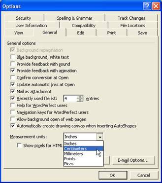 Pentru aranjarea textului in pagina, puteti folosi atat comenzile din caseta de dialog Paragraph - din meniul Format, cat si caseta de dialog Page Setup din meniul File. Ca sa nu faceti treaba de mai multe ori, va sugeram urmatoarea operatie: selectati din meniul Tools, caseta de dialog Options, General. Din lista derulanta cu unitati de masura (measurement units) selectati centimetrii sau milimetrii, nu inci.