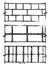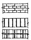Fig.28 Alcatuirea peretilor despartitori; a - zidarie de caramida plina asezata pe cant; b - zidarie de caramida plina asezata pe lat; c - zidarie din blocuri ceramice cu goluri orizontale de 200x135x290 mm asezata pe lat (linia punctata reprezinta rosturile alaturate, iar linia groasa este linie de tesere).
