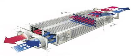 Aerul rece, proaspat, preluat din atmosfera, este introdus in schimbator pe un traseu paralel cu cel al aerului exhaustat, unde se incarca termoenergetic pana la o anumita temperatura si este introdus in incapere deja incalzit.