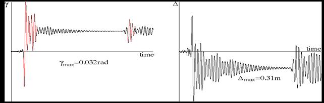 - accelerogramele El Centro 1940 (fig. 11) si Mexico City 1995 (fig. 12) produc deplasari laterale si rotiri ale barelor disipative mici D = 13 cm si gp= 0,009 rad. Fortele taietoare la baza structurii si ordonata maxima a energiei disipate sunt de 70% si respectiv 35% din valorile celor produse de accelerograma Vrancea 1977.