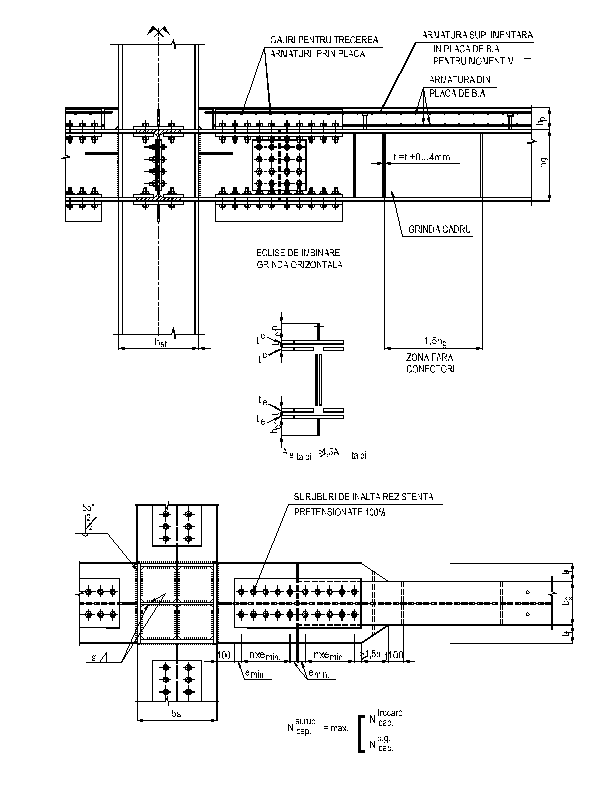 Pe aceasta zona nu vor fi prevazuti conectori. Placa de beton armat va rezema pe grinzile secundare, care delimiteaza bara sau zona disipativa. {n lungul grinzilor secundare se vor realiza rosturi patrunse, prevazute cu conectori orizontali pentru a nu fi afectat efectul de saiba. Conectorii vor permite in schimb, rotirea in plan vertical.