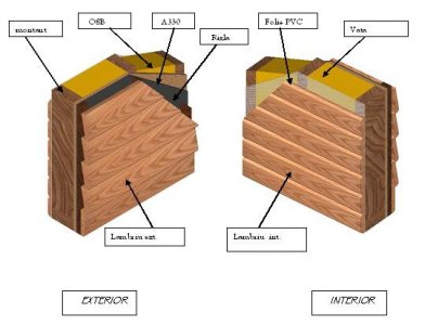 - sistemul de constructie se bazeaza pe un schelet portant, compus din grinzi ecarisate de (150-200) x (150-200) mm , imbinate in cele mai spectaculoase forme. Acest schelet este acoperit pe exterior de pereti sandwich, ca in sistemul log frame.