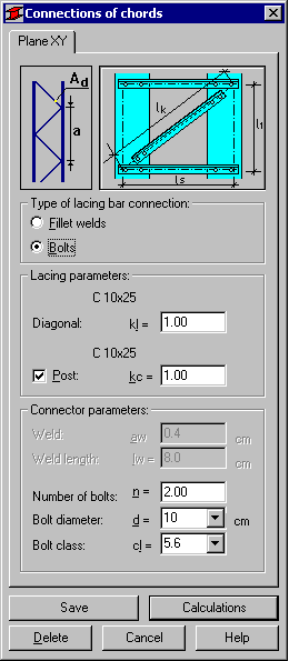 After verification of a complex member there is a possibility to select and verify elements connecting individual member chords. Analysis of chord connections in a complex member is run by pressing the Lattice button in the Detailed Results dialog box. The Connection of Chords dialog box consists of two tabs containing data about connectors in planes XY and XZ needed for calculations. For each of the planes the analysis is carried out independently.