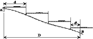 lata si bolobocul (figura 4.3) - se foloseste o scandura dreapta, lata de 15 cm, groasa de 5 cm si lunga de 3, 4 sau 5 m.Aceasta scandura se aseaza orizontal, cu un capat in punctul A. Pentru orizontalizarea ei se va folosi un boloboc. Celalalt capat se va marca pe teren cu ajutorul unui fir cu plumb lasat sa plonjeze pe langa scandura. Originea urmatoarei aplicari a latei va fi locul in care firul cu plumb atinge pamantul. Operatiunea se repeta pana la terminarea tronsonului AB. Distanta orizontala intre A si B va fi data de relatia: DAB = n . d + d' [4.12] unde d' se determina prin masurare pe lata, iar d reprezinta lungimea latei.