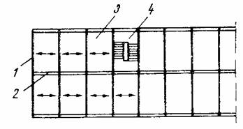 Fig. 1.5 Plansee cu placi si grinzi din beton armat la constructii cu diafragme din beton armat - sisteme celulare: 1 - diafragme de beton armat; 2 - grinzi de fatada; 3 - grinda de beton armat in cadrul planseului.