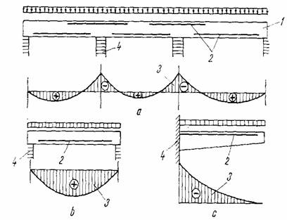 Fig. 1.6 Principiul de asezare a armaturii de rezistenta: a - grinda continua pe mai multe reazeme; b - grinda simplu rezemata; c - grinda in consola; 1 - grinda de beton armat; 2 - armatura de rezistenta; 3 - diagrama de momente incovoietoare; 4 - reazem vertical.