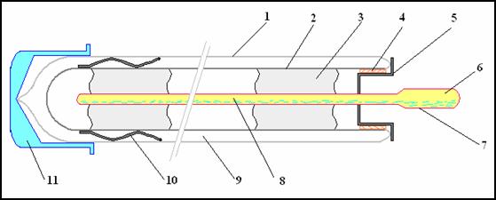 Cele doua tuburi concentrice din sticla (1 si 2) sunt lipite la capatul superior (din dreapta) si spatiul dintre ele este vidat (9). La capatul inferior (din stanga) cele doua tuburi din sticla sunt mentinute la distanta, de patru lamele elastice din otel inox (10). Radiatia solara traverseaza spatiul vidat si se acumuleaza sub forma de caldura in spatiul din jurul tevii de cupru (7) din centru. Teava de cupru este, la randul ei vidata si contine o cantitate mica de apa distilata care, datorita temperaturii crescute vaporizeaza iar vaporii migreaza la partea superioara, in tubul de condensare (6). Datorita depresiunii din spatiul de vaporizare (8), apa din interior se transforma in vapori la temperaturi sub valoarea normala (punctul de fierbere al apei la presiunea atmosferica este de 100 C). Vaporii preiau caldura si o transporta gravitational (de aici rezulta impunerea ca tuburile sa fie montate cu o inclinatie de 30.70) in spatiul 6 unde, daca intalnesc suprafata unui schimbator de caldura cu temperatura sub cea de condensare, cedeaza caldura si se intorc la baza tubului sub forma de picaturi de condens. Ciclul se reia atata timp cat exista o diferenta pozitiva de temperatura intre incinta 8 si incinta 6. Temperatura in spatiul de condensare (6) poate ajunge la valori destul de mari (aprox. 150C-200C) in cazul in care capatul tubului nu este introdus intr-un schimbator de caldura.