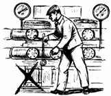 Art.251. Buteliile care nu au inele pot fi pastrate in pozitie orizontala pe rama de lemn sau stelaje care nu vor depasi cinci randuri, iar ventilele, protejate cu capace, sa fie intr-o singura directie (fig. 25).