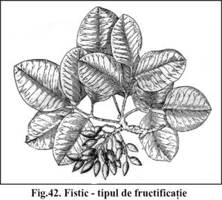 Fisticul (fig. 42) se prezinta sub forma unui arbustoid sau arbore, inalt pana la 10-15 m, cu trunchiul care poate atinge grosimea de 30-40 cm. Coroana este globuloasa sau turtita, deasa. Frunzele sunt cazatoare, compuse cu foliole de forma ovat-alungita, lucioase pe fata superioara si pubescente pe fata inferioara. Este planta unisexuat dioica. Fructul este o drupa monocarpelara (monosperma) de culoare cafenie.
