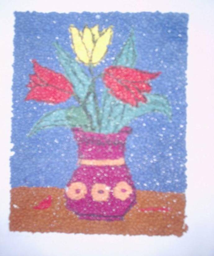 Prezint elevilor tabloul cu "Vaza cu lalele", realizat din hartie creponata, prin mototolire si lipire. |