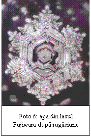 In anul 1996, savantul japonez a realizat un experiment extraordinar pe lacul Fujiwara din Japonia, lac foarte poluat, aflat intr-o zona industriala. Cateva mii de oameni s-au rugat in grupuri, intr-un templu sau chiar pe lac. Emoto a prelevat apa din lac inainte de rugaciune si dupa doua ore de rugaciune. Apoi a analizat la miscroscop structura apei in cele doua situatii. Apa din lac inainte de rugaciune, era formata din particule haotice si stranii (fotografia 5), pe cand apa prelevata dupa cele doua ore de rugaciune avea structura unor cristale armonioase, curate, in forma de flori (fotografia 6). Mai mult, japonezul a observat ca structura cristalina a apei se pastreaza chiar timp de o luna dupa rugaciune. Cu alta ocazie, un calugar zen a facut o rugaciune de o ora pe malul unui lac imens, tot in Japonia. Ca si in cazul lacului Fujiwara, s-au observat diferente uriase intre structura apei cristalizate, inainte si dupa rugaciune.