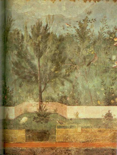 Fig. Domus Livia, Roma, sec I p. Chr., pictura murala, peretele nordic al camerei cu gradina (Ad Gallinas Albas- Locul gainilor albe),
