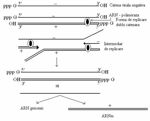 La virusurile cu genom ARN de polaritate negativa (grupul Mononegavirales- paramixo-, rhabdo-, filovirusuri), mesagerii si catenele genomice sunt transcrise de pe matrite diferite: catena de polaritate negativa a formei dublu catenare functioneaza ca matrita pentru transcrierea ARNm monocistronici, iar cea de polaritate pozitiva este transcrisa in copii de lungimea genomului (fig. 90), de polaritate negativa, cu rol de ARN genomic. Replicarea se deosebeste de transcriere prin modul in care progreseaza ARN-pol: continuu sau secvential.