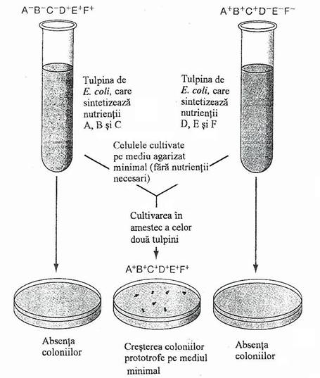 Cultivate izolat, pe mediul minimal, cele doua tulpini bacteriene nu cresc (nu formeaza colonii). In experienta propriu-zisa de conjugare, cele doua tulpini bacteriene (cate lo8 celule din fiecare), au fost puse in contact pentru un interval, in mediul lichid si ulterior au fost insamantate pe mediul minimal solidificat. Dupa 24 de ore se inregistreaza aparitia coloniilor prototrofe. In experienta de control, cultivarea tulpinilor A si B, separate, pe mediul minimal, nu genereaza aparitia coloniilor.