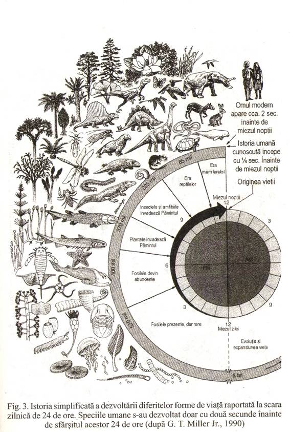 In Fig. 3. se prezinta istoria simplificata a dezvoltarii diferitelor forme de viata si releva sincronizarea grupelor mai importante de plante si animale.