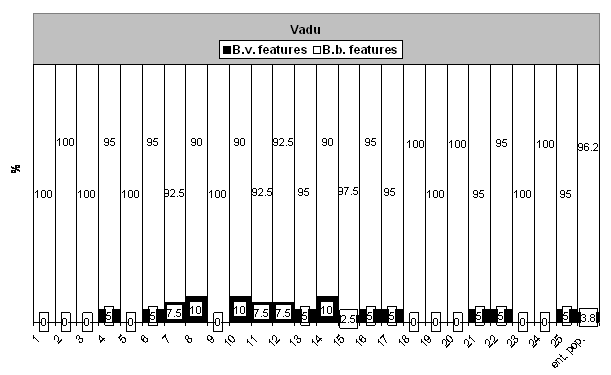 Populatia din Vadu are doar 3 % caractere de Bombina variegata, asa ca putem spune ca aici avem o populatie mai pura de Bombina variegate. Putem spune ca valoarea mica apare datorita morfologiei habitatului. Bombina bombina prefera balti largi cu multa vegetatie (asa cum arata habitatul din Vadu ). Asa ca altitudinea joasa si morfologia acestul habitat face ca procentajul acestui rezultat sa fie mai mic. Din nou Bombina variegata cu suma caracterelor de 5 este prezenta in 56% dintre indivizi.