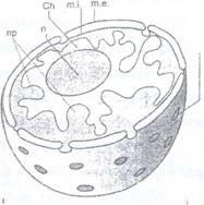 Fig. 67: Schema structurii si componentei unui nucleu interfazic. me- membrana externa; mi- membrana interna; Ch-cromatina; Pn- pori nucleari; n- nucleol; np- nucleoplasma.