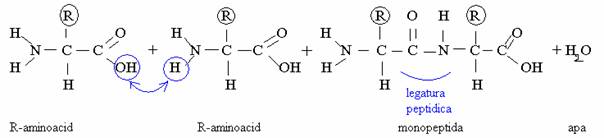 Legatura peptidica se face intre gruparea - COOH a unui aminoacid si gruparea - NH2 a altui aminoacid. Monopeptidele reactioneaza si ele cu un alt aminoacid formand o tripeptida si asa pana la formarea de macromolecule (polipeptide).In cursul fiecarei reactii, este eliminata o molecula de apa(H2O). Este, deci o sinteza prin deshidratare.