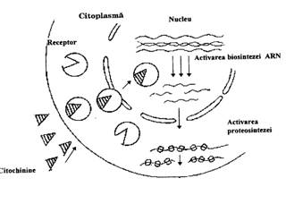 Actiuni fiziologice La nivel celular, actiunea fiziologica a citochininelor se manifesta prin stimularea diviziunii celulare. Citochininele stimuleaza biosinteza acizilor nucleici, in special a ARN-m, cu rol in sinteza proteinelor, stimuleaza biosinteza ARN-polimerazelor si intensifica activitatea functionala a nucleului. In citoplasma, citochininele determina intensificarea dezvoltarii reticulului endoplasmatic, sporirea numarului de ribozomi in special al polizomilor si intensifica translatia (fig. 106). In cloroplaste se formeaza noi grane si lamele, iar in mitocondrii creste numarul crestelor mitocondriale. Prin acest efect, citochininele intarzie imbatranirea si provoaca intinerirea tesuturilor.
