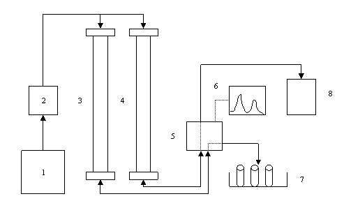 Figura 5.3 Schema de principiu a unei instalatii de separare prin cromatografie pe gel permeabil rezervor pentru solvent; 2 pompa; 3 coloana de separare; 4 coloana de rferinta ;5 -ssitem de detectie; 6 inregistrator; 7 colector de fractiuni ; 8 colector de solvent pentru circuitul de referinta).