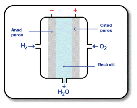 In urma reactiei de oxidare a combustibilului (hidrogenul) si de reducere a oxidantului (oxigenul), intre cei doi electrozi apare o diferenta de potential. Oxidarea are loc la anod, care devine negativ, iar reducerea are loc la catod, care devine pozitiv. Cei doi electrozi sunt porosi (de exemplu catodul este din Ni sau din aliaje Ni-Ag, iar anodul din negru de platina sau din paladiu), iar electrolitul este un material ceramic, o solutie alcalina, o membrana schimbatoare de protoni etc. Electrolitul joaca un rol cheie, permitand trecerea intre anod si catod numai a anumitor componenti. Electrozii sunt in acelasi timp si catalizatori pentru reactiile: