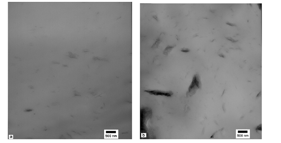 Imaginile microscopice TEM (figura 3a si 3b) arata ca organo-argilele de 04POSS-BDA si 04POSS-TA cu un grad ridicat de polaritate a dus la o dispersie mica si la formarea de agregate din matricea PP. In timp ce organo-argilele de 04POSS-08ODA si 04POSS-08DMDTA cu polaritate relativ scazuta sunt mult mai dispersibile (figura 3c si 2d), particulele subtiri de argila sunt obtinute intercalate printre care si unele exfoliate.
