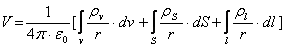 Potentialul si intensitatea campului electric produs de sarcina electrica din intreg volumul v se poate deduce prin integrarea expresiilor de mai sus pe intreg volumul v: