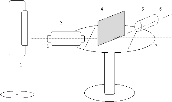 EXPLICATII : (1) lampa, (2) fanta, (3) colimator, (4) reteaua de difractie, (5) luneta, (6) ocular, (7) goniometru (scala gradata pentru masurarea unghiurilor)