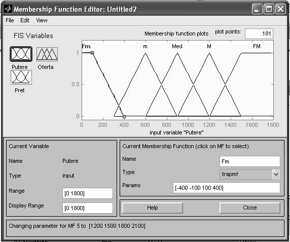 Am redenumit "input1", "input2" si "output1" cu numele variabilelor din problema: putere, pret si respectiv oferta. Am deschis caseta grafica a variabilei "putere" (dublu click pe ea), apoi am sters toate functiile prezente din editorul Membership Function, meniul Edit, selectand Remove All MFs, si am adaugat 5 functii necesare pentru problema de fata din meniul Edit - Add MFs, si in lista Number of MFs am selectat 5, dupa cum se observa in imaginea urmatoare: