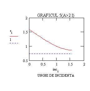 Daca unghiul refringent al prismei este egal cu unghiul limita atunci toate razele incidente pe fata AB a prismei care au unghiul de incidenta cuprins in intervalul [0, 90o] vor avea unghiul de incidenta pe fata AC a prismei mai mic decat unghiul limita, cu exceptia razei care intra pe fat a AB sub unghiul de incidenta i= 0, pentru care unghiul de incidenta pe fata AC este egal cu unghiul limita (vezi graficul 1). Acest lucru poate fi dedus si din relatia (3), relatie in care daca introducem i=0 ob tinem: