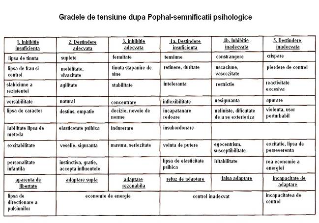 Cele 5 grade de tensiune identificate de Pophal ( I., II., III., IV.a., IV.b., V.) sunt date de functionarea cortexului si a subcortexului. Cele 2 parti ale subcortexului -palidum si striatum- sunt responsabile pentru elaborarea a 2 tipuri de scris. Efectul striatum-ului genereaza un scris nesigur, rigid si nu suficient de bine coordonat. Palidum-ul este responsabil pentru miscari neinhibate, dezlantuite, dezordonate. Echilibrul celor 2 efecte produce scripturile subcorticale, care sunt recunoscute ca fiind ritmice si echilibrate. Acest tip de oameni se descurca mai usor in viata decat primele 2 tipuri.