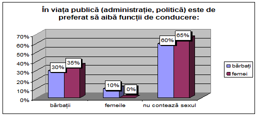 Din totalul respondentilor 51,3% sunt de parere ca si barbatii si femeile muncesc la fel de mult, un rocent de 39,3% considera ca femeile sunt acelea care muncesc mai mult, iar numai 9,4% au declarat ca barbatii sunt cei care muncesc mai mult (vezi anexe, pagina )