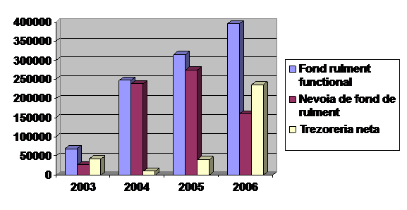 Fondul de rulment financiar in perioada analizata inregistreaza valori pozitive si in crestere de la un an la altul, ceea ce inseamna ca resursele permanente finanteaza integral alocarile permanente, ramanand si un surplus pentru finantarea unei parti a activelor circulante. Acest fapt este consecinta cresterii capitalurilor permanente, in conditiile mentinerii activelor imobilizate nete la aproximativ acelasi nivel pe primii 3 ani si o triplare a acestora in ultimul an