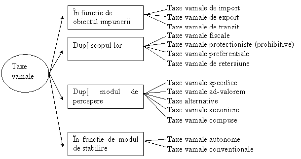 Schema cu clasificarea taxelor vamale, in functie de mai multe criterii, se prezinta astfel: