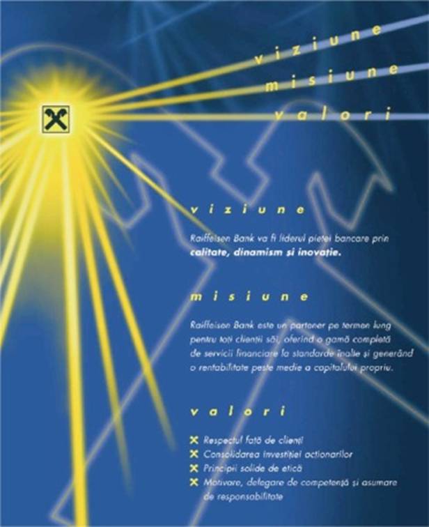 VIZIUNE, MISIUNE, VALORI: trei cuvinte care definesc esenta ca organizatie, care descriu principiile de baza ale activitatii, care includ trecutul si prezentul, dar mai ales definesc viitorul. Definirea elementelor continute in VIZIUNEA, MISIUNEA SI VALORILE Raiffeisen este un proces consolidat in timp si se bazeaza pe experienta celor peste 130 de ani de activitate sub numele de Raiffeisen. Prin lansarea programului 'VIZIUNE, MISIUNE, VALORI', Raiffeisen Bank a facut un pas decisiv in sensul definitivarii identitatii sale.