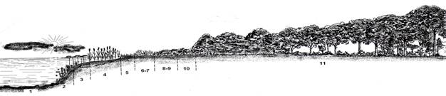 Fig. 6-8 Stratificare a vegetatiei pe orizontala si verticala, ilustrand principalele comunitati vegetale, pe un transect de la lac la padure (dupa Collier si colab. 1974). 1 - zona speciilor de adancuri; 2 - zona plantelor submerse; 3 - zona plantelor plutitoare; 4 - zona plantelor aeriene emerse din apa adanca; 5 - zona plantelor aeriene emrse din apa putin adanca (plante de margine); 6 - zona speciilor ierboase de margine (zona speciilor higrofile; zona stufului); 7 - zona plantelor ierboase higrofile indicatoare (Carex si Juncus); 8 - zona de izlaz (cu specii ierboase si lemnoase); 9 - zona de amestec (plante ierboase si tufarisuei); 10 - zona tufarisurilor