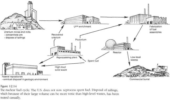Buna gospodarire a deseurilor radioactive prezinta si ea o importanta crescanda. Depunerile de reziduuri apropiate de suprafata sunt factori de risc pentru o durata de mii de ani. O metoda promitatoare consta in depozitarea intr-un mediu geologic selectat cu grija si monitorizat in mod constant. Se poate obtine un rezultat promitator si in conditiile stocarii monitorizate controlate in zone de mica adancime (Fig. 12.14, 12.16).