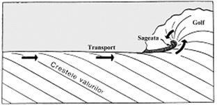 Fig. 19. Recurbarea sagetilor litorale datorita actiunii combinate a valurilor care se propaga din directii diferite (Selby, 1985).