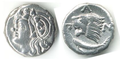 de fata a fost emisa in Lucania - Pe avers bustul zeitei Athena cu un coif attic pe cap. Pe revers un cap de leu si un delfin. Moneda este de marimea si greutatea originalului.