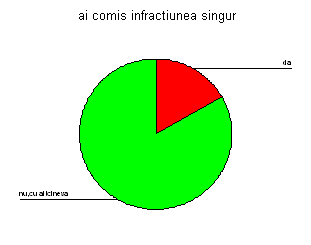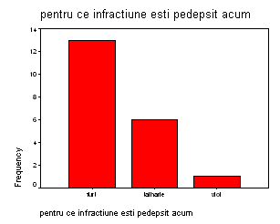 Testul statistic pentru egalitatea variabilelor releva un nivel de semnificatie ridicat (p =0,166) care obliga spre utilizarea testului t pentru variante egale. Acesta (t =1,688; df = 35; p = 0,100 >0,05) sustine faptul ca mediile celor doua grupe de minori pedepsiti penal nu difera semnificativ in functie de tipul infractiunii comise-furt sau talharie. In concluzie, diferenta dintre valorile medii (4,05 si 3,29) ale celor doua grupe de minori condamnati penal care au comis infractiunea de talharie sau de furt, in majoritatea cazurilor, in ceea ce priveste asumarea responsabilitatii fata de pedeapsa primita, nu este semnificativa din punct de vedere statistic. La aceeasi constatare se ajunge si prin observarea intervalului de incredere (-0,15; 1,66) pentru diferenta dintre cele doua valori, care contine zero, concluzionand ca diferenta dintre valorile medii ale celor doua grupe de minori condamnati penal in ceea ce priveste asumarea responsabilitatii fata de pedeapsa primita in raport cu infractiunea savarsita-furt sau talharie , nu este semnificativa din punct de vedere statistic. Se poate concluziona ca nu exista o legatura intre asumarea responsabilitatii in randul minorilor condamnati penal fata de fapta comisa - si tipul infractiunii: furt sau talharie